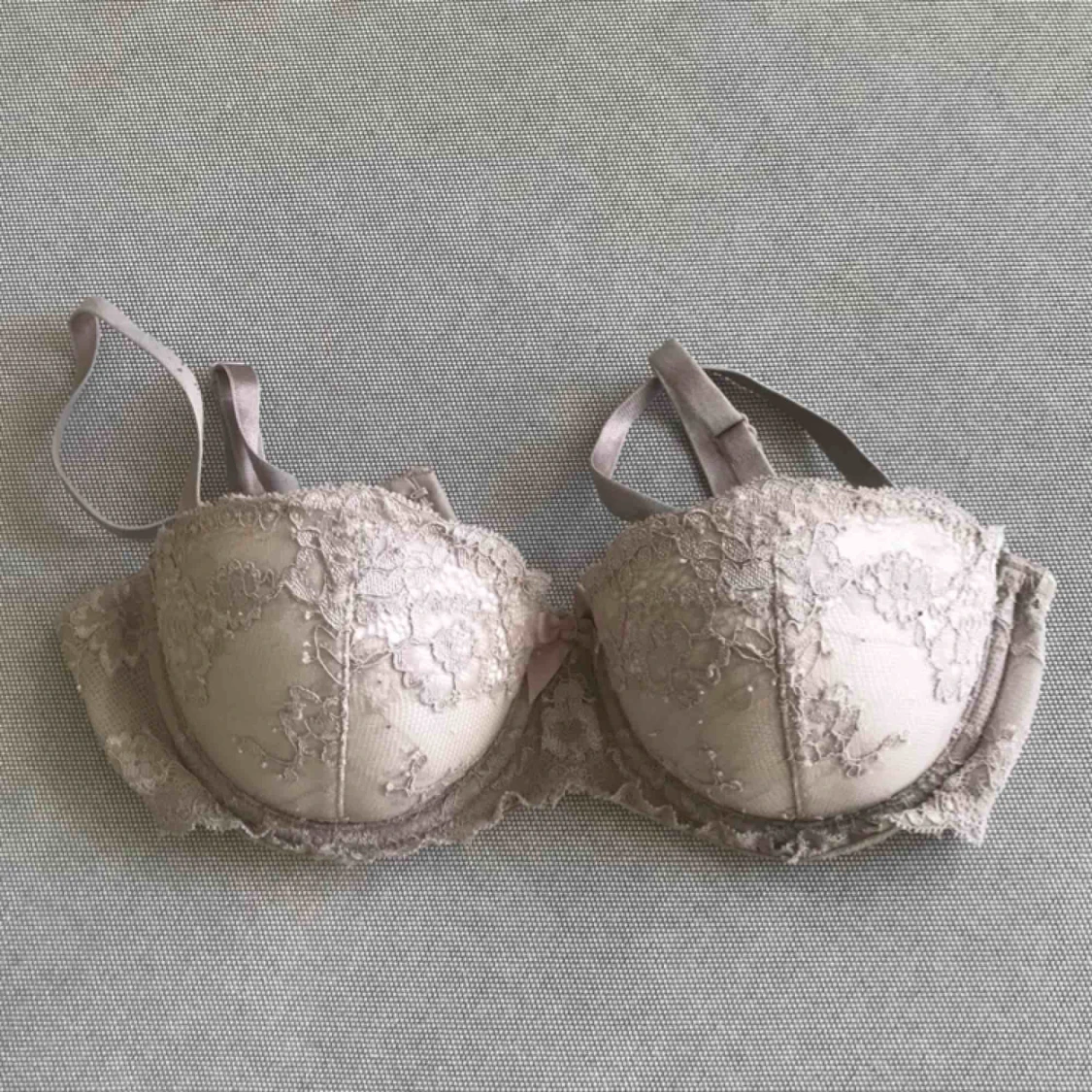 Grårosa balconettebh med spets. Knappt använd men har tyvärr fått några nopror efter tvätt (se bild 2). Har ej tappat form eller har uttänjda axelband 🌱