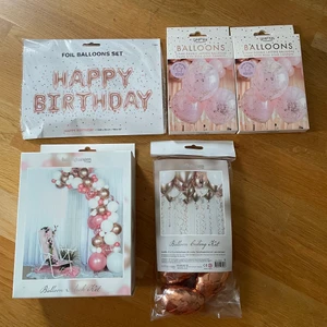 Allt är oanvänt och oöppnat. Ballongbåge DIY, nypris 279kr Ballongkit till tak, nypris 125kr 3 pack rosa ballonger, nypris 59kr/styck Folieballonger happy birthday, nypris 89kr Mitt pris 300kr