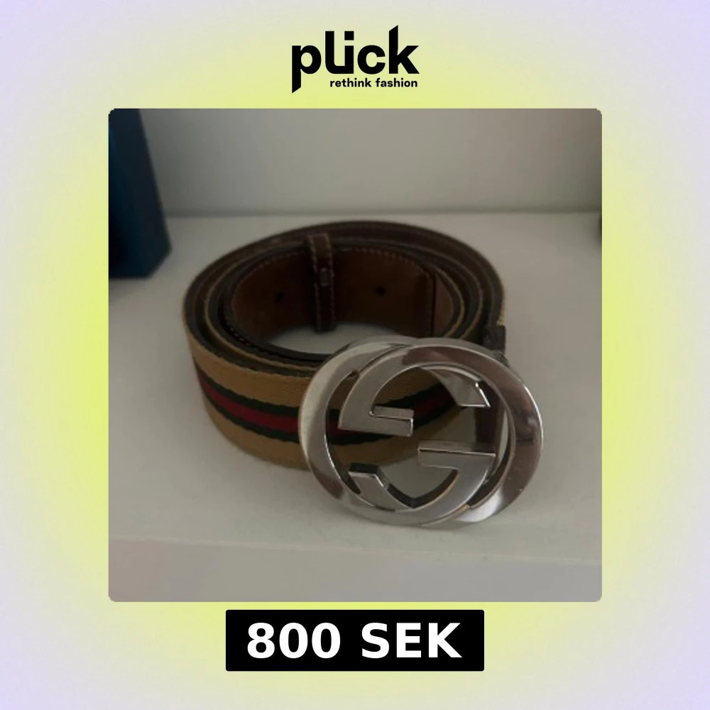 Snyggt bälte med klassiskt GG-spänne i silverfärgad metall. Bältet har en gul bas med gröna och röda ränder längs mitten och insida i brunt skinn. Perfekt accessoar för att lyfta din outfit med en lyxig touch.