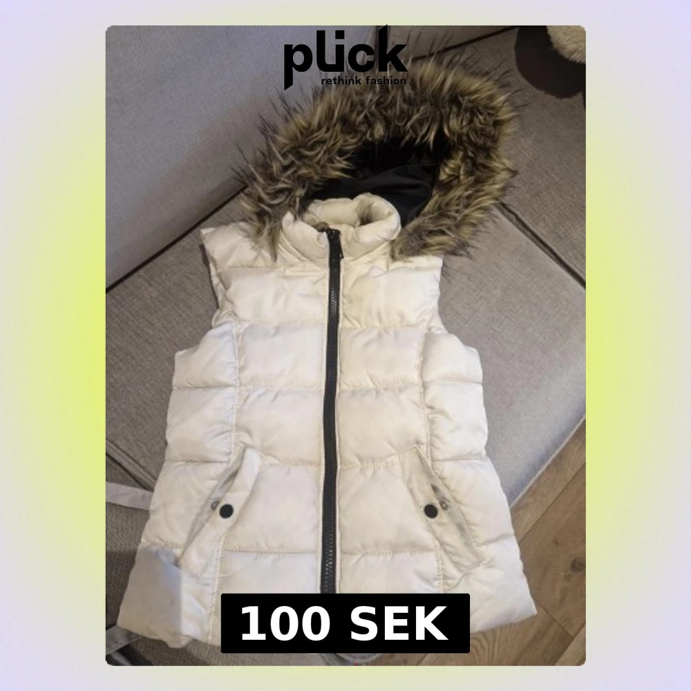 Säljer en vit dunväst från H&M med huva och fuskpälsdetalj. Västen är otroooligt vacker blir ledsen att behöva sälja den, har quiltad design, två fickor med knappstängning och dragkedja framtill. Perfekt för kyliga dagar när du vill vara både varm och snygg.