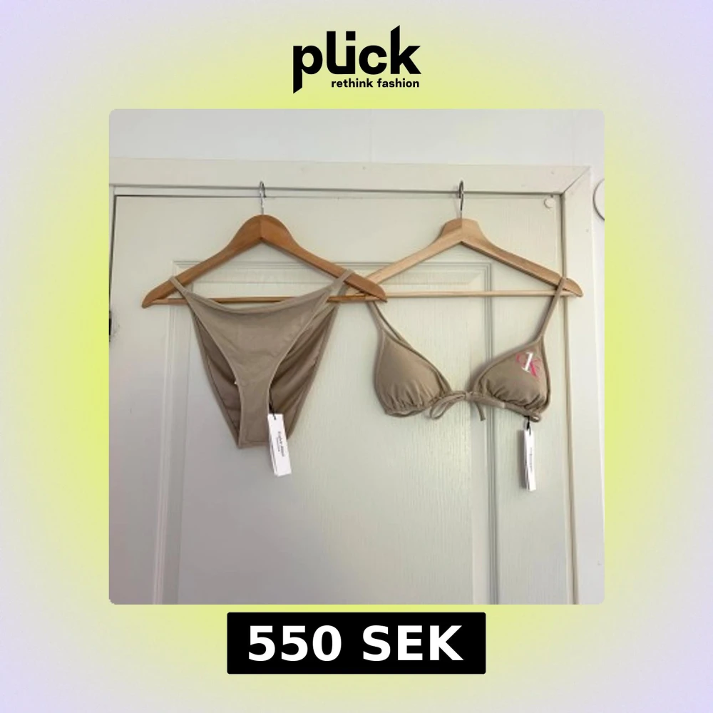 Snygg beige bikini från Calvin Klein med klassisk triangel-bh och smala axelband. Både överdel och underdel har broderad CK-logga i vitt och rosa. Bikinin har knyt framtill på överdelen och är tillverkad i mjuk syntet. Underdel storlek L men tycker den sitter bra på M för att undvika att den ”skär in” på höfterna. Överdel storlek S. Nypris underdel 549 sek, överdel 599 sek.