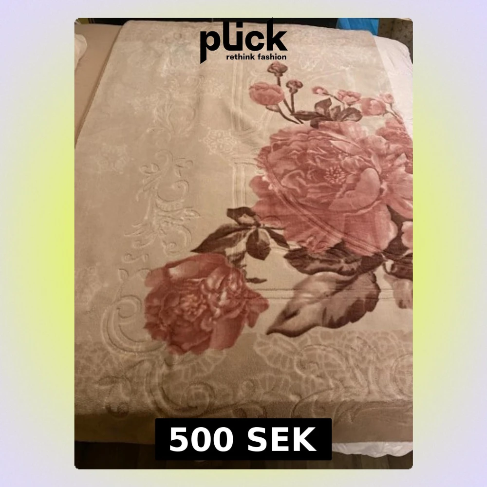 Säljer en beige blanket med stort blommigt mönster i rosa och bruna toner. Den har en mjuk och fluffig känsla, perfekt för att hålla värmen.