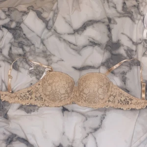 Säljer en elegant beige bh med spetsdetaljer. Den har justerbara axelband och hakknäppning bak. Helt ny i storlek 70B. Medföljer genomskinliga axelband.