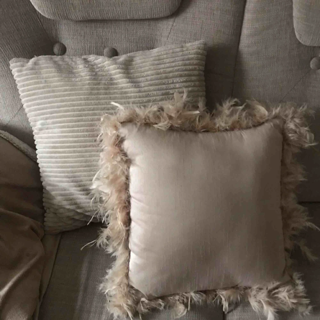 Dekorationskuddar i beige. 80kr för båda. Finns i Vasastan, Stockholm