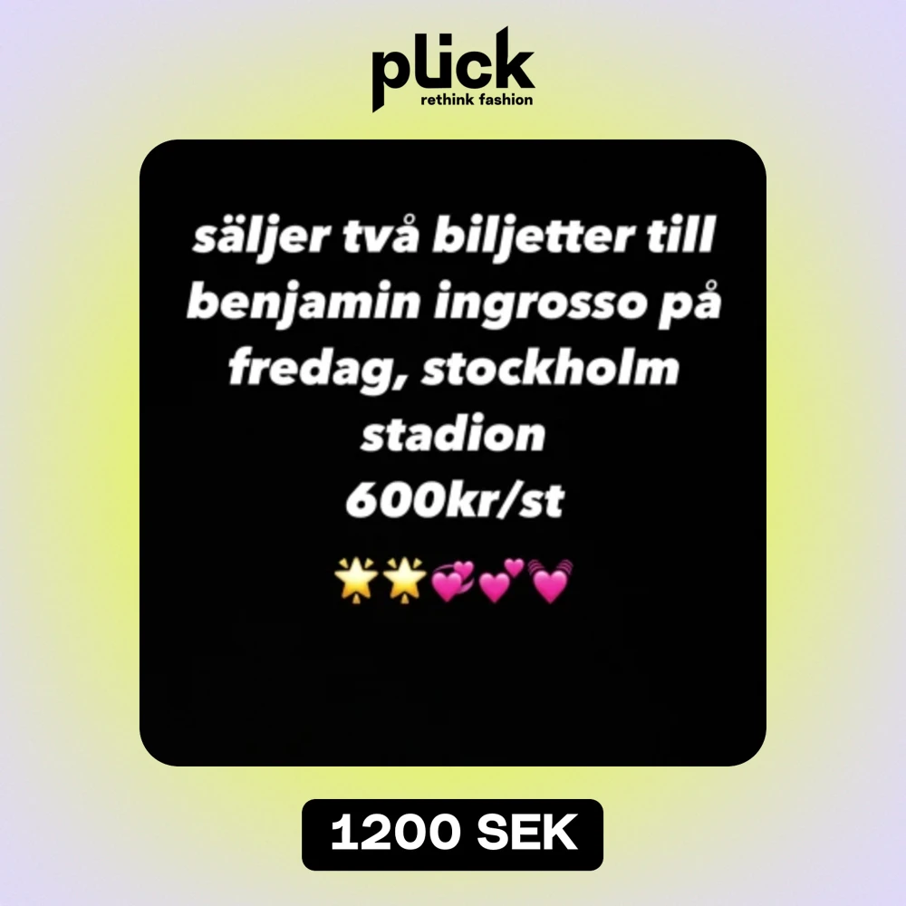 Två konsertbiljetter till Benjamin Ingrosso på Stockholm Stadion fredag 9/8, ståplatser. Insläpp från 18 konserten börjar 20!
