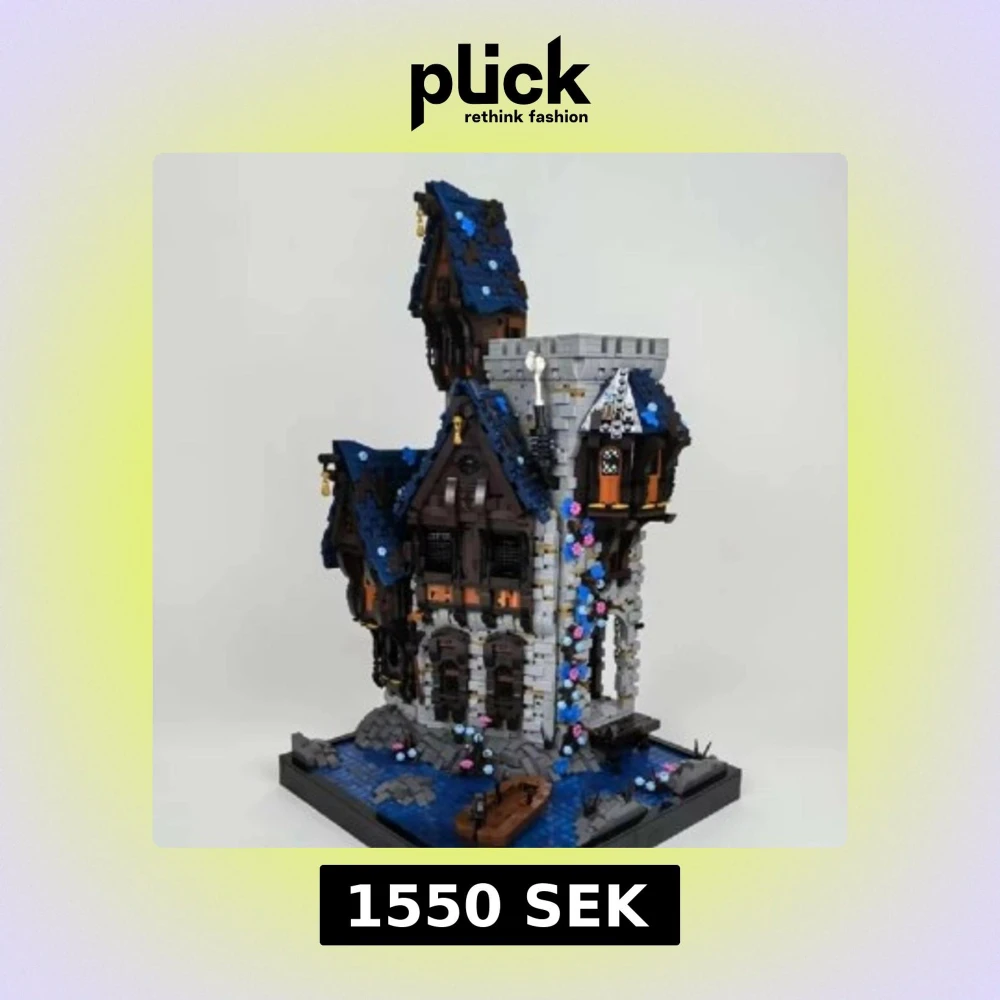 Detaljerad byggsats av ett medeltida hus med blått tak och stenväggar. Inkluderar en båt och blomsterdetaljer. Perfekt för byggentusiaster som gillar historiska teman. Helt ny. Oöppnat. Redo att skickas direkt