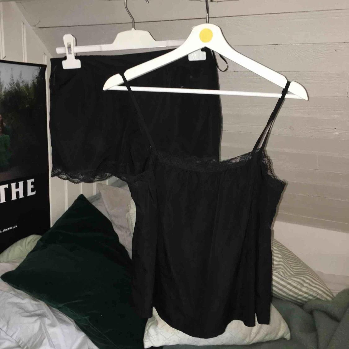 Fint pyamasset med spetskanter. Jättefint skick. Shortsen har 2 pyttesmå vita fläckar. Shortsen är i xs och linnet är i s!