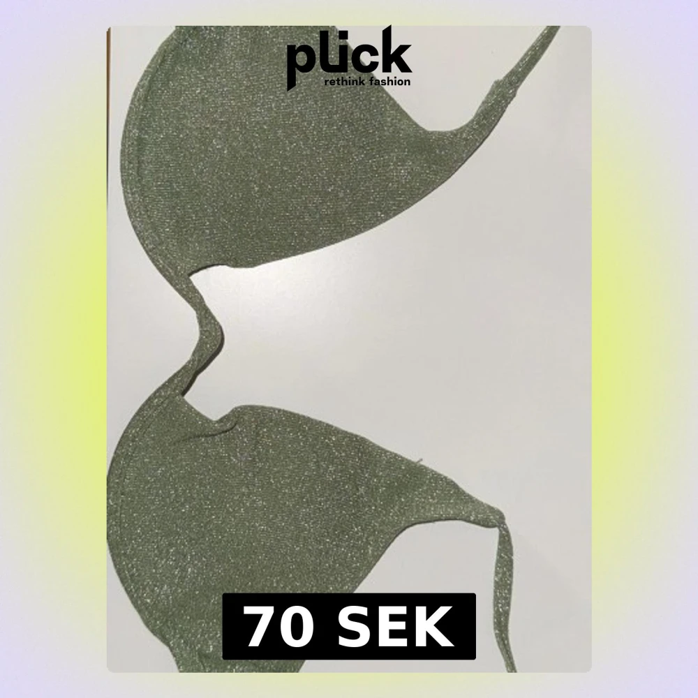 Snygg grön bikini topp med glittrigt tyg och smala axelband. Bikini toppen har en triangelformad design och knytning i ryggen för justerbar passform. Perfekt för dig som gillar att sticka ut med lite extra glitter i outfiten. Den har byglar och stel form.