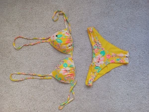 Gul blommig mönstrad bikini från Bik Bok. Underdelen är i storlek M och överdelen XL.