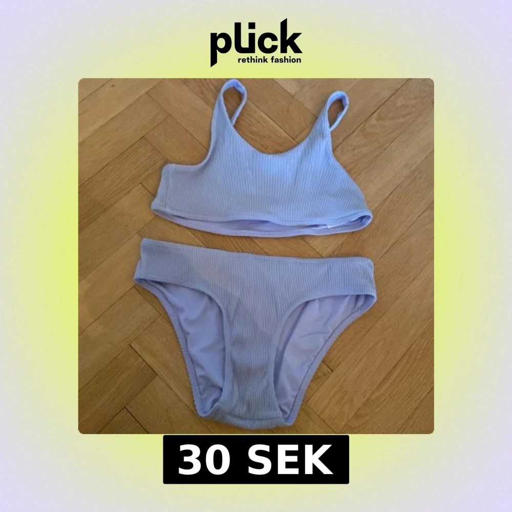 Säljer en ljuslila bikini med ribbat tyg. Överdelen har breda axelband och en sportig, enkel design utan vaddering. Underdelen är klassisk med medelhög midja. Perfekt för stranden eller poolen!