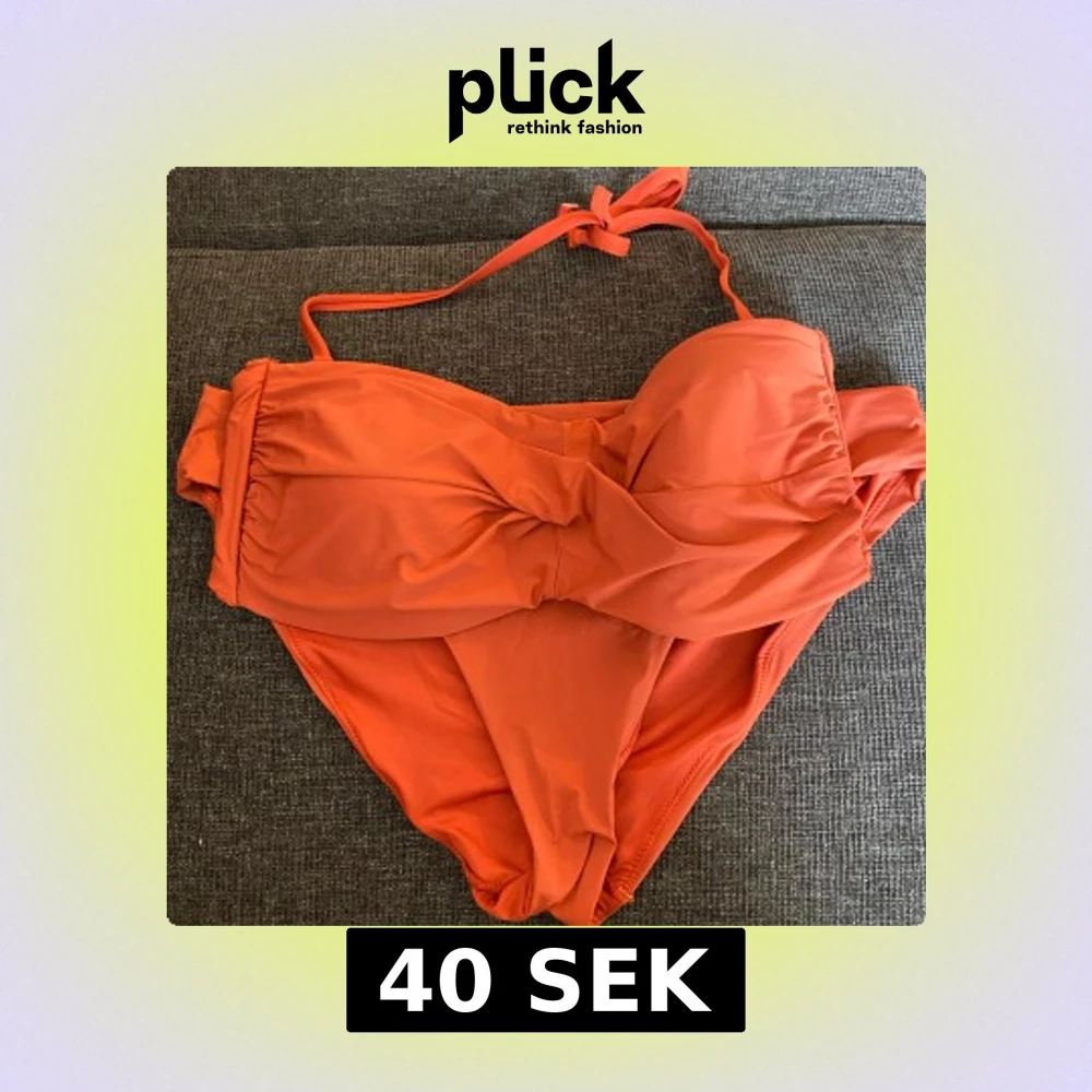 Snygg orange bikini med bandeau-topp som har twistad detalj framtill och knytband i nacken. Matchande bikinitrosa i enkel modell. Perfekt för stranden eller poolen, och färgen poppar verkligen i solen. Kan mötas upp i Trollhättan eller Alingsås. Kan skickas men då tillkommer en fraktkostnad.