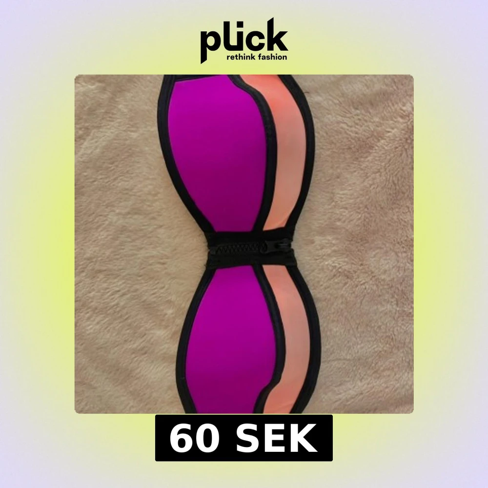 Trendig bikinitop i snygg lila och ljusrosa färg. Pads i och dragkedja fram. Knäppe där bak. Sitter tajt runt om och håller sig uppe. Passar tyvärr inte mig längre, köpte för något år sedan men endast använd under en sommar☀️🩷💜