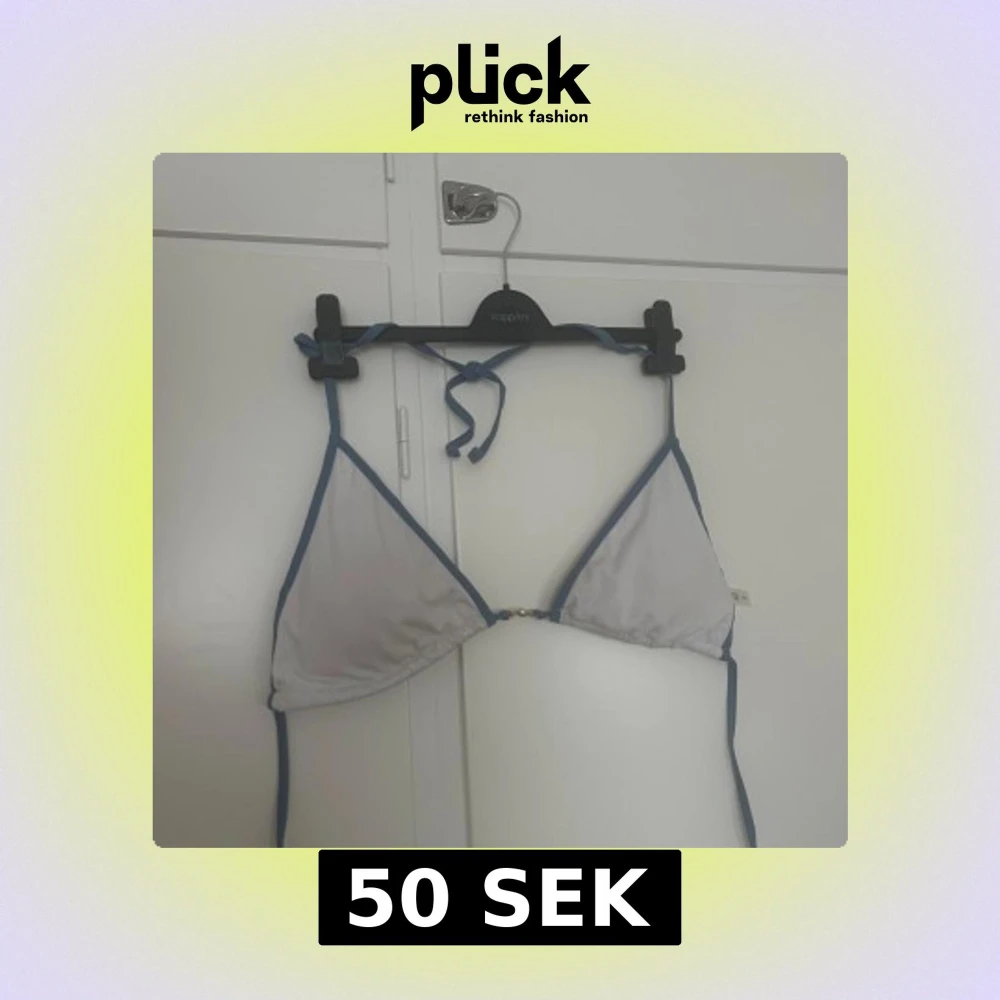 Säljer en vit trekantsbikini med blå kant och knyt i nacken. Klassisk modell med tunna band och enkel design, perfekt för stranden eller poolen.