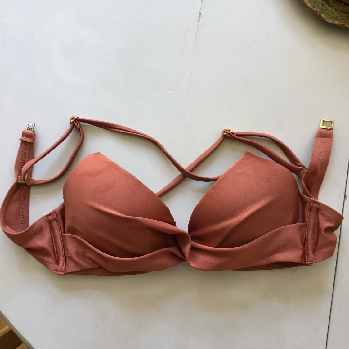 Bikini överdel/bh med reglerbara band, går att ändra till korsad rygg eller vanligt. Lite skadad i knäppning från saltvatten. Använd sparsamt Hämtad i Stockholm eller skickas mot frakt