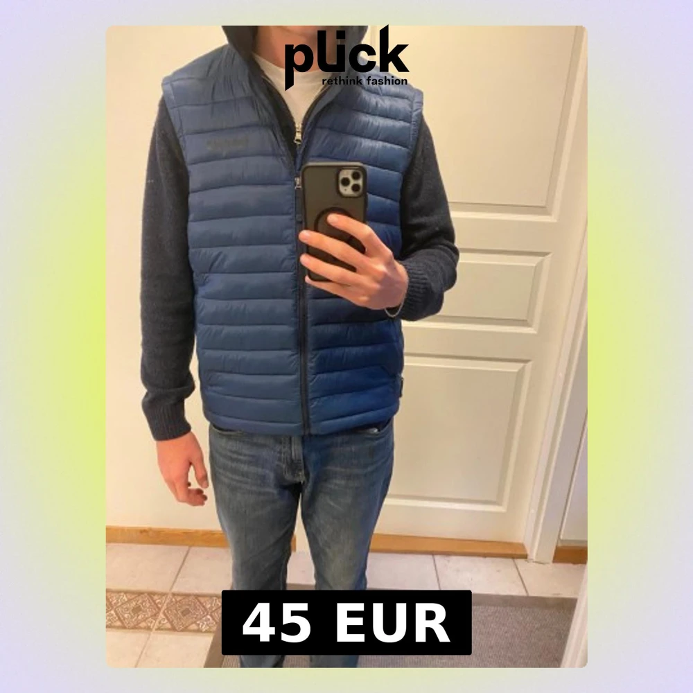 Säljer en blå dunväst från Timberland i storlek M. Västen har quiltad design, ståkrage och dragkedja framtill. Tillverkad av 100% återvunnet syntetmaterial, lätt och packbar. Perfekt för lager-på-lager och snygg till jeans eller hoodie.