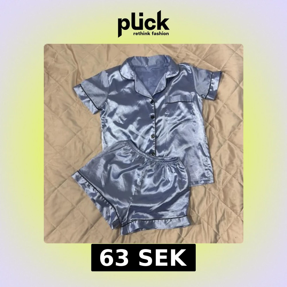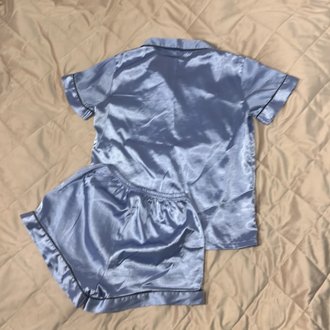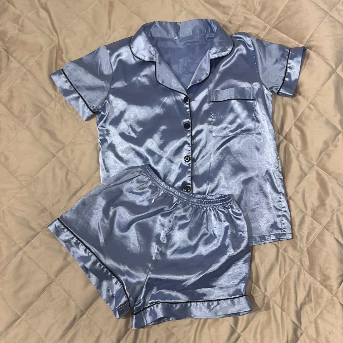 Snygga blå pyjamas i satin med svart piping längs kanterna. De har en loose passform och elastisk midja för extra komfort. Perfekt för chillkvällar hemma. Matchande kortärmad skjorta med knappar ingår från SHEIN.