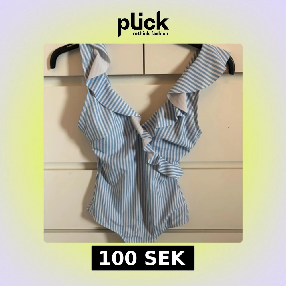 Supersöt baddräkt med blåvita ränder och volangdetaljer längs axelbanden och framtill. Perfekt för strand eller pool! Snygg och trendig modell med feminina detaljer.