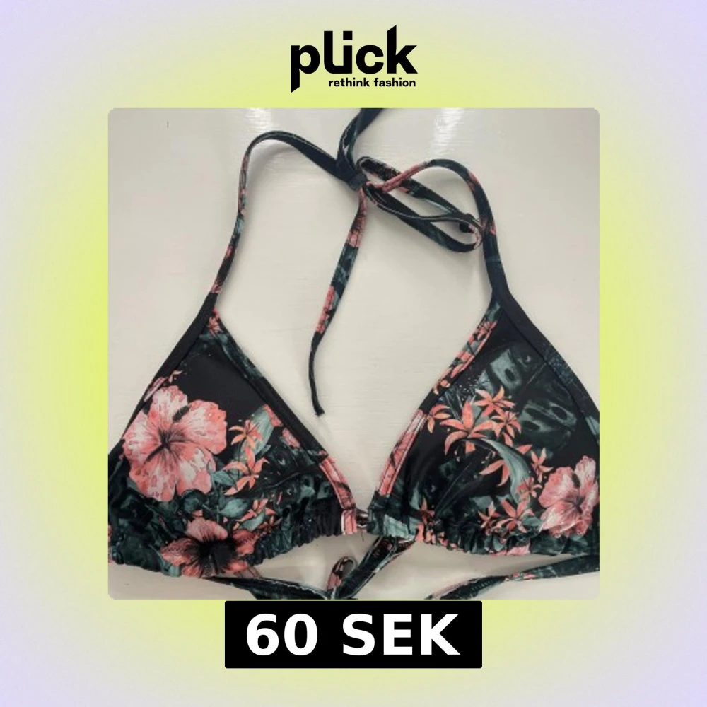 Snygg bikiniöverdel med blommigt mönster i rosa och grönt på svart bakgrund. Toppen har knytband runt nacken och ryggen för justerbar passform. Den är använd ett fåtal gånger. Perfekt nu till sommaren!