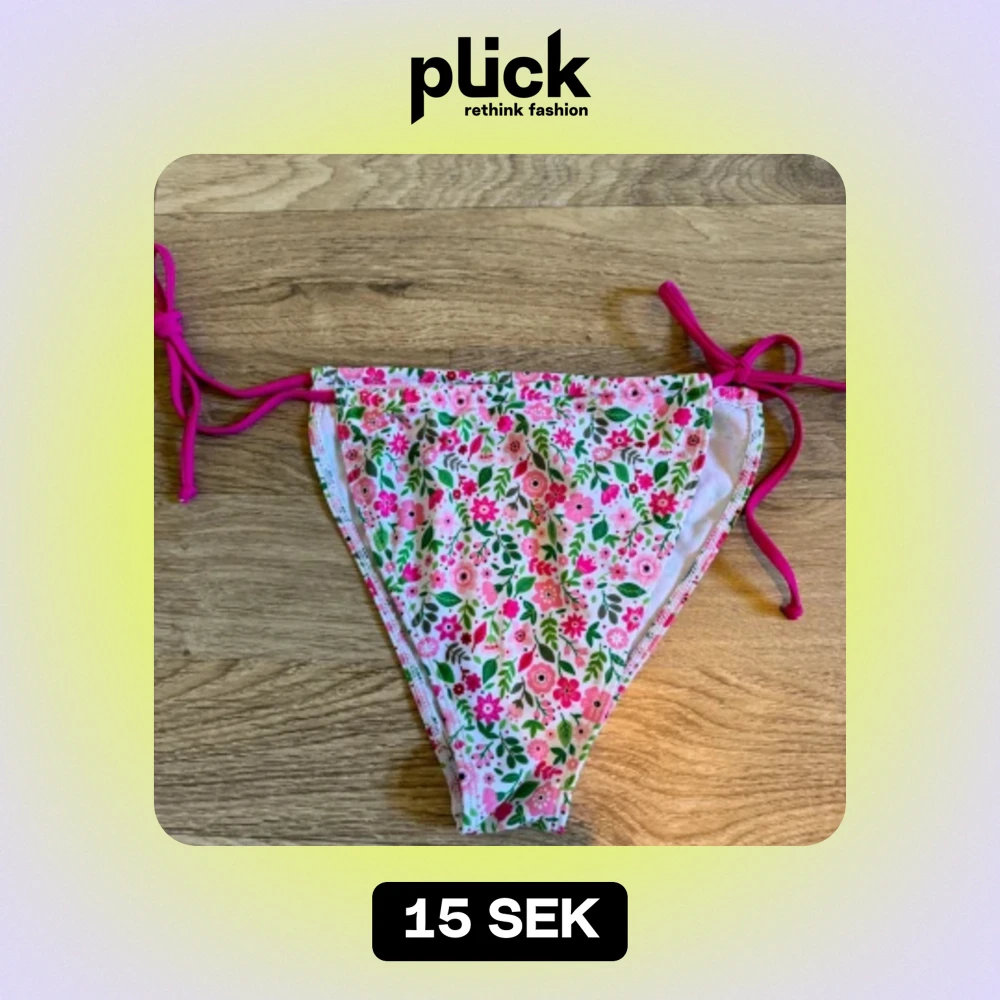 En färgglad bikiniunderdel med blommigt mönster i rosa, grönt och vitt. Underdelen har knytband på sidorna för justerbar passform. Helt ny.
