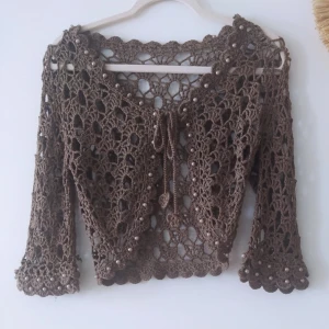 Säljer denna jättesöta stickade boleron med bruna pälor pärlor på. Boleron passar mig som har storlek S💕|| Lånade bilder‼️‼️