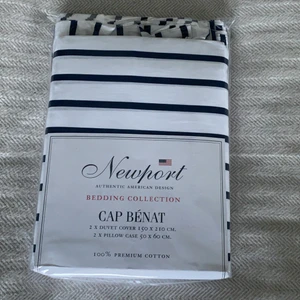 Fick detta superfina marinblå/vitrandiga påslakanset i födelsedagspresent, men passade tyvärr inte med färgerna i min lägenhet. Har öppnat paketet för att testa hur det ser ut, men är i övrigt oanvänt. Paketet består av 4 delar: 2 örngott och 2 påslakan. Kostar 1390 i nypris, länk till hemsidan: https://www.newport.se/shop/newport/newport-sanglinne/cap-benat-paslakanset-vitbla.