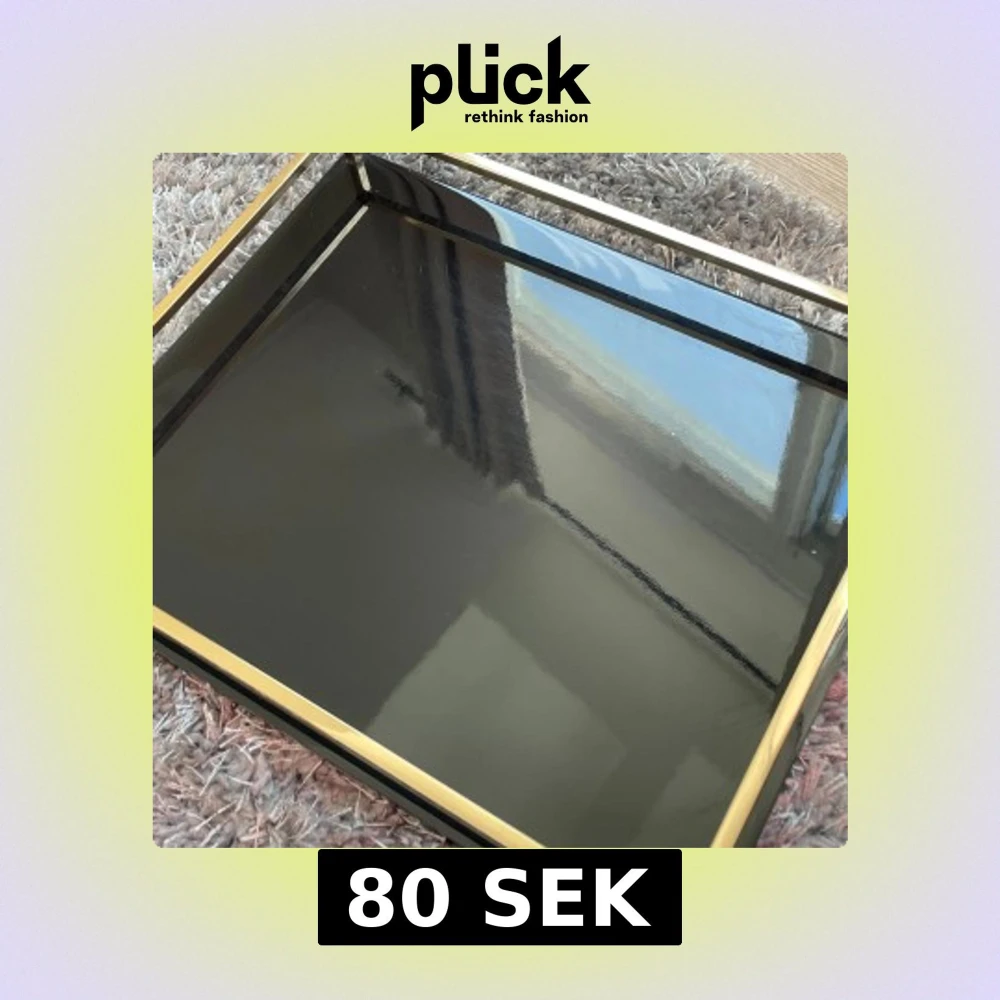 Bilderna visar en bricka från H&M Home. Produkten har en elegant design med guldfärgade kanter och svart yta, och ser ut att vara i mycket gott skick utan synliga defekter eller slitage.