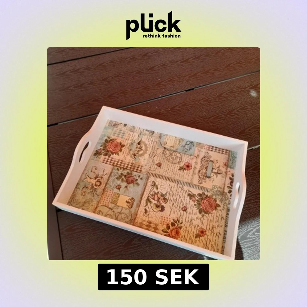 Serveringsbricka gjort av decoupagepapper i gammeldags stil som går i beige/blåa nyanser. Mått 35x25cm