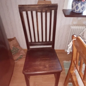 Fyra brunbetsade köksstolar /vardagsrumsstolar i trä. Fint skick .hämtas i Skene enligt överenskommelse .