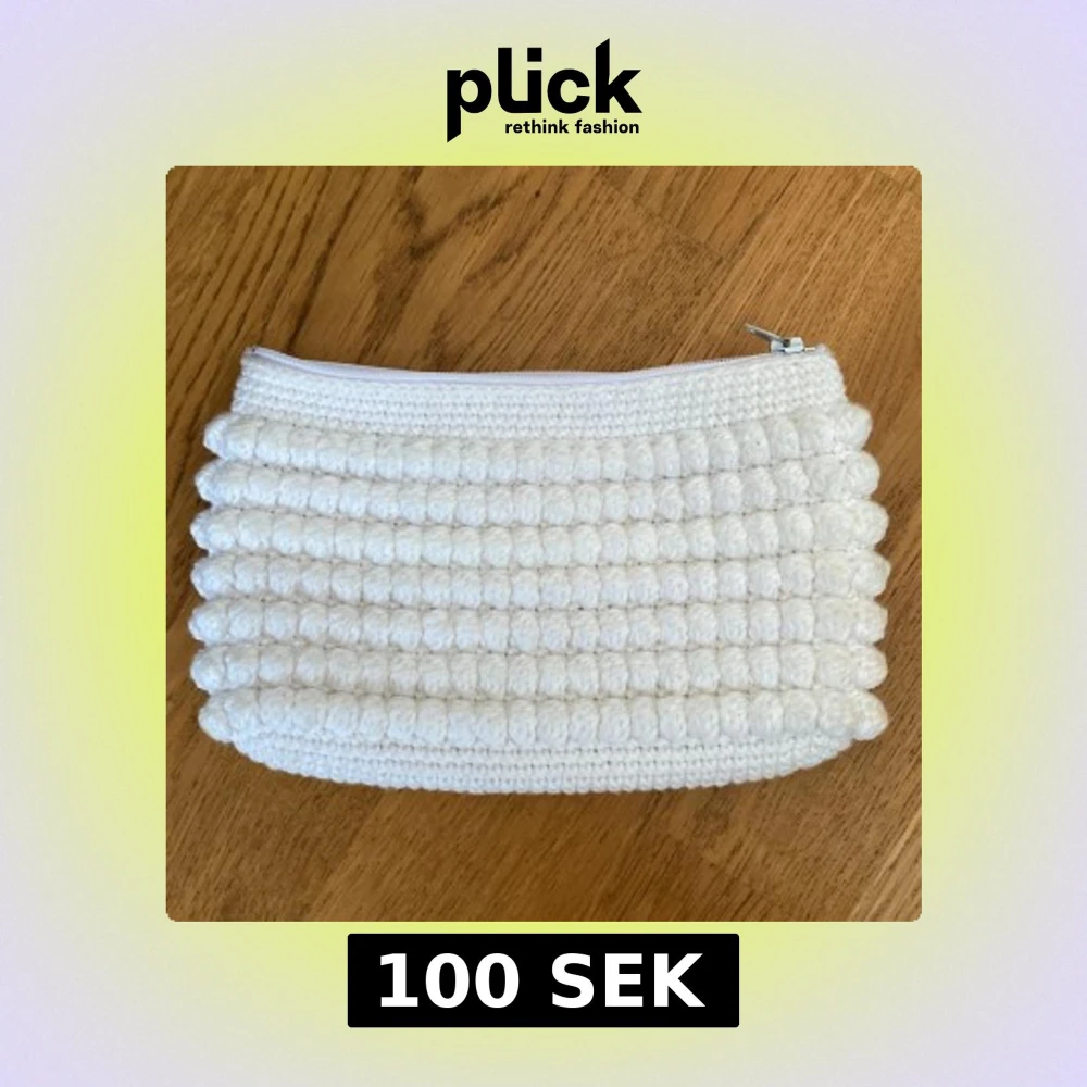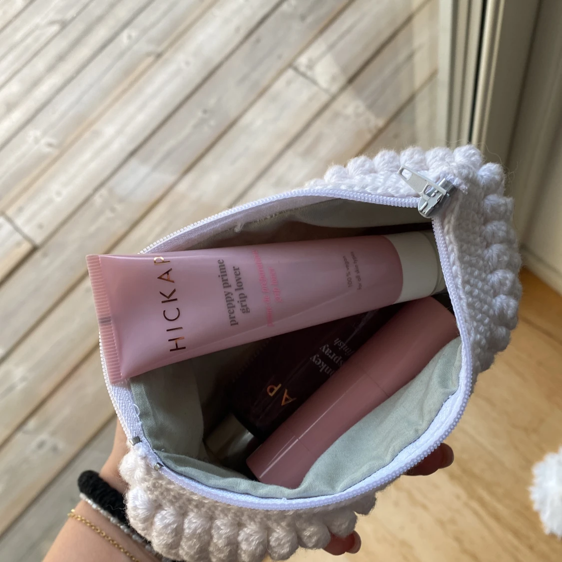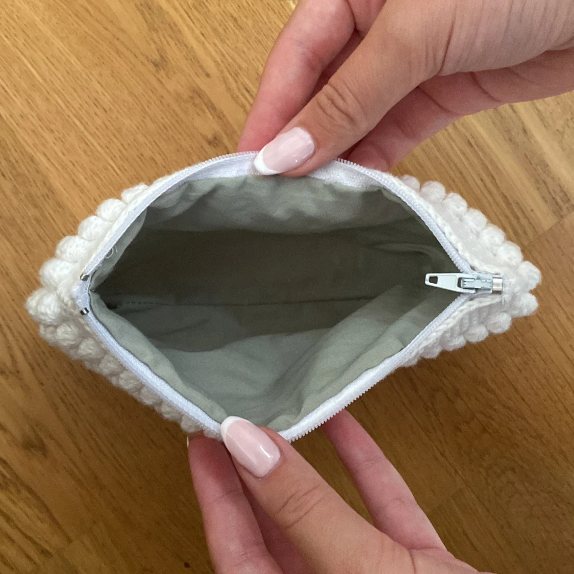 Superfin hemmagjord vit necessär i virkat material med bubblig struktur. Necessären har ett ljusgrönt innerfoder och stängs med en vit dragkedja upptill. Perfekt storlek för smink eller småprylar. Höjd 12cm, bredd 20cm, Du står för frakten, vid mer info skriv
