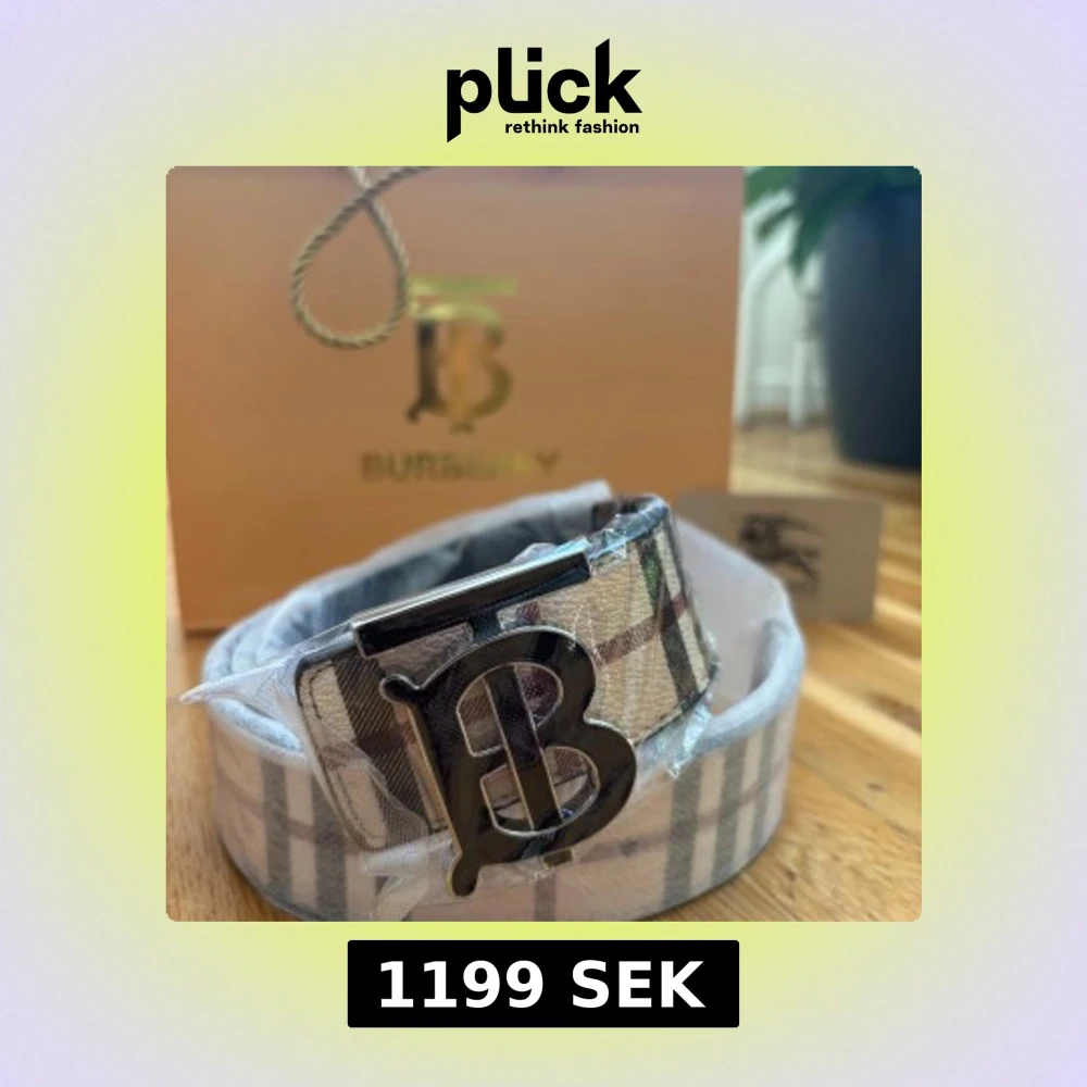Snyggt Burberry-bälte i klassiskt rutigt mönster med stora B-spännet i metall. Ena sidan är beige med svarta och röda rutor, andra sidan är helsvart med diskret rutmönster och Burberry-ryttare. Tillverkat i skinn och levereras med originalpåse och box. Storlek fixare ingår!