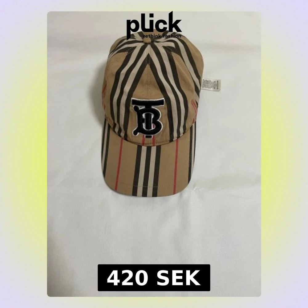 Säljer en snygg keps från Burberry med klassiskt randigt mönster i beige, svart, vit och röd. Kepsen har en broderad TB-logga framtill och är tillverkad i 100% bomull. Perfekt accessoar för att lyfta din stil.