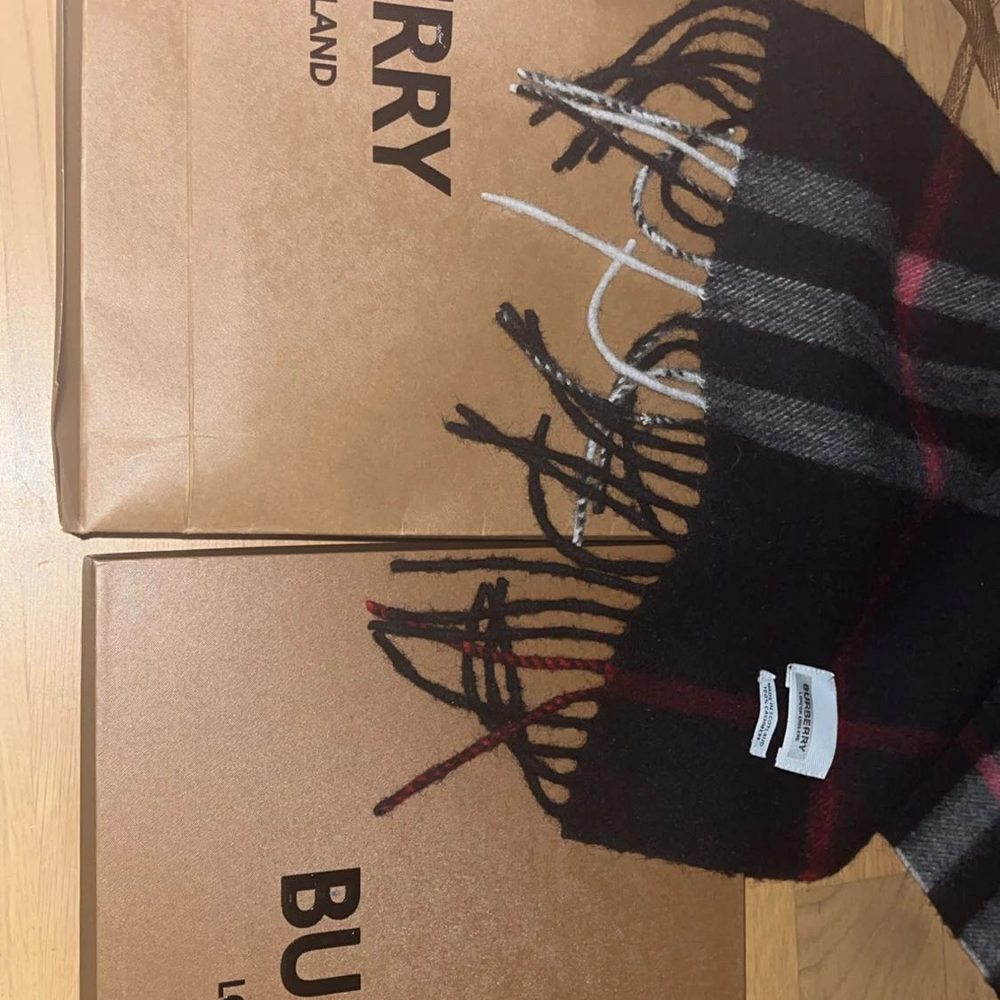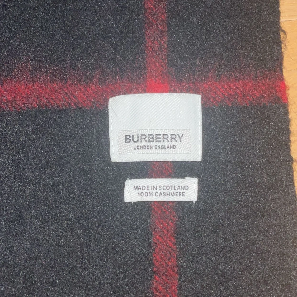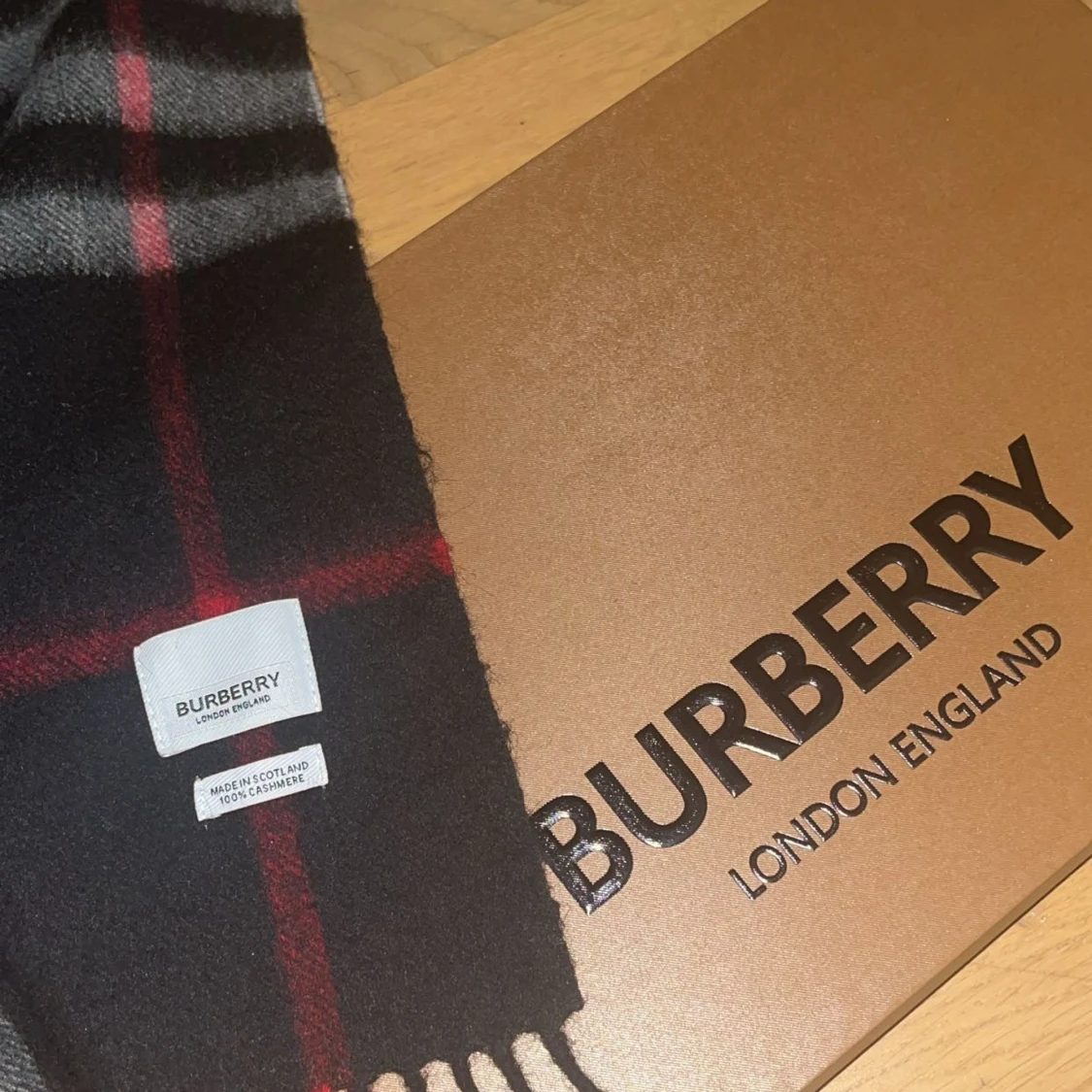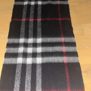 Säljer en elegant rutig halsduk från Burberry i svart, grått, vitt och rött. Tillverkad i Skottland av 100% kashmir, vilket gör den supermjuk och lyxig. Perfekt för att hålla dig varm och stilren under kyliga dagar. Kommer med originalförpackning.