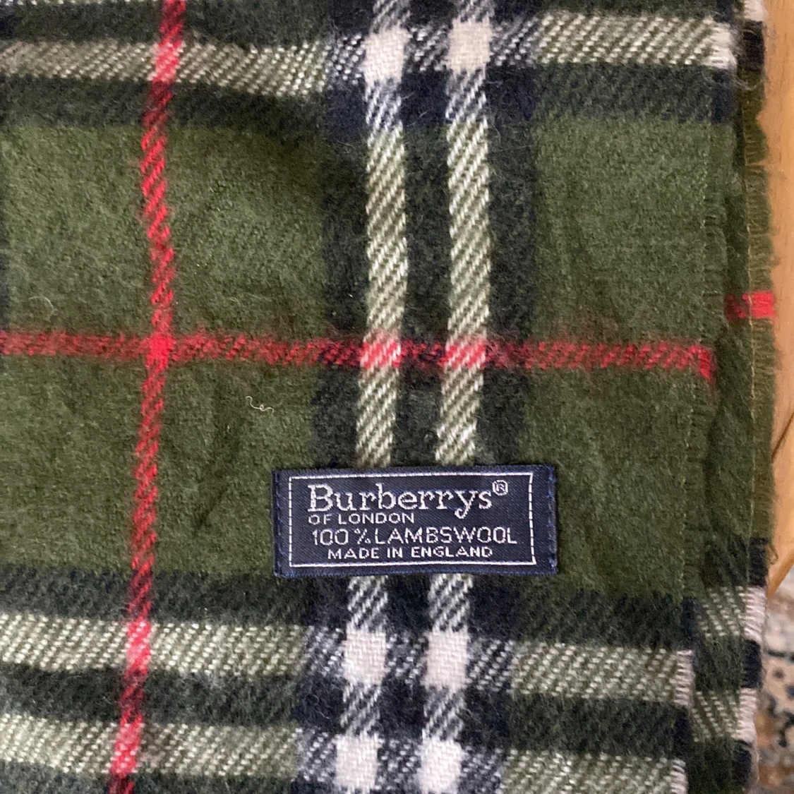 Snygg grön halsduk från Burberrys i klassiskt rutigt mönster med inslag av vitt, svart och rött. Gjord i 100% lammull och har fransar i ändarna. Perfekt accessoar för att lyfta din outfit med en tidlös brittisk vibe.