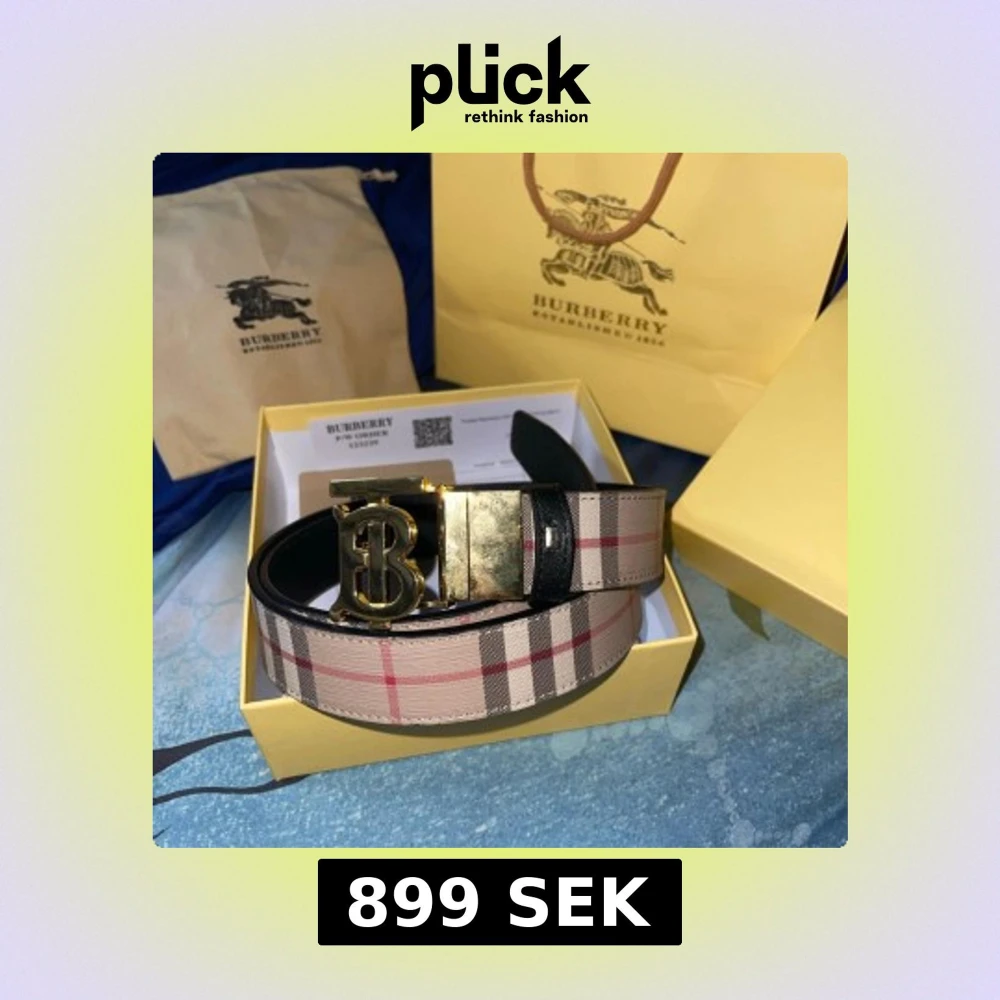 Snyggt Burberry-bälte i klassiskt beige, svart och rött rutigt mönster. Skärpet har ett stort metallspänne med Burberrys ikoniska B-logga i guld eller silver. Tillverkat i skinn med svart insida och exklusiv känsla. Perfekt accessoar för att lyfta din outfit.105,110,115 storlek.