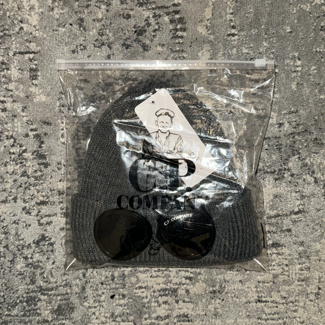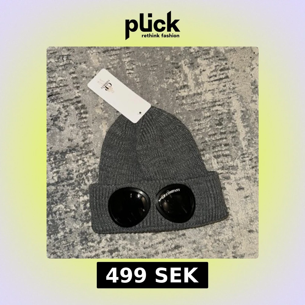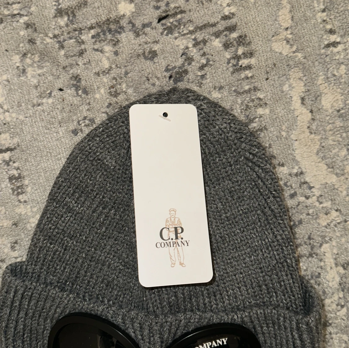 Säljer en grå mössa från C.P. Company med ikoniska svarta goggles på uppviket. Mössan är ribbstickad och har en snygg, urban look som sticker ut. Har kvitto också