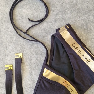 Svart/guld bikini. Ej använd då den är för liten. Stl M underdel Stl L i överdel