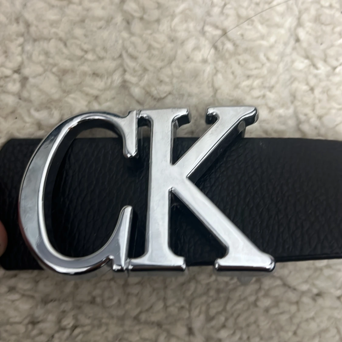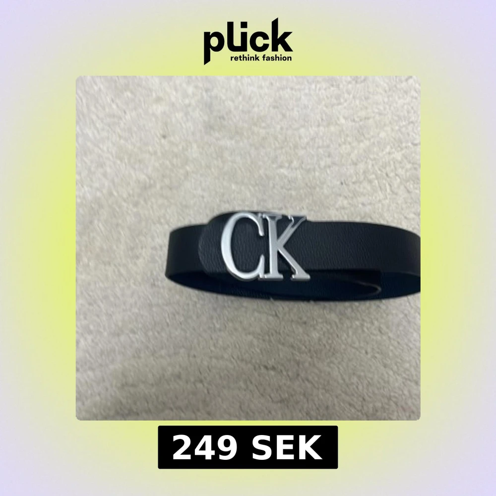 Snyggt svart skärp från Calvin Klein med bred rem i skinn och en stor, blank silverspänne med CK-logga. Perfekt accessoar för att lyfta din outfit med en stilren och modern touch.