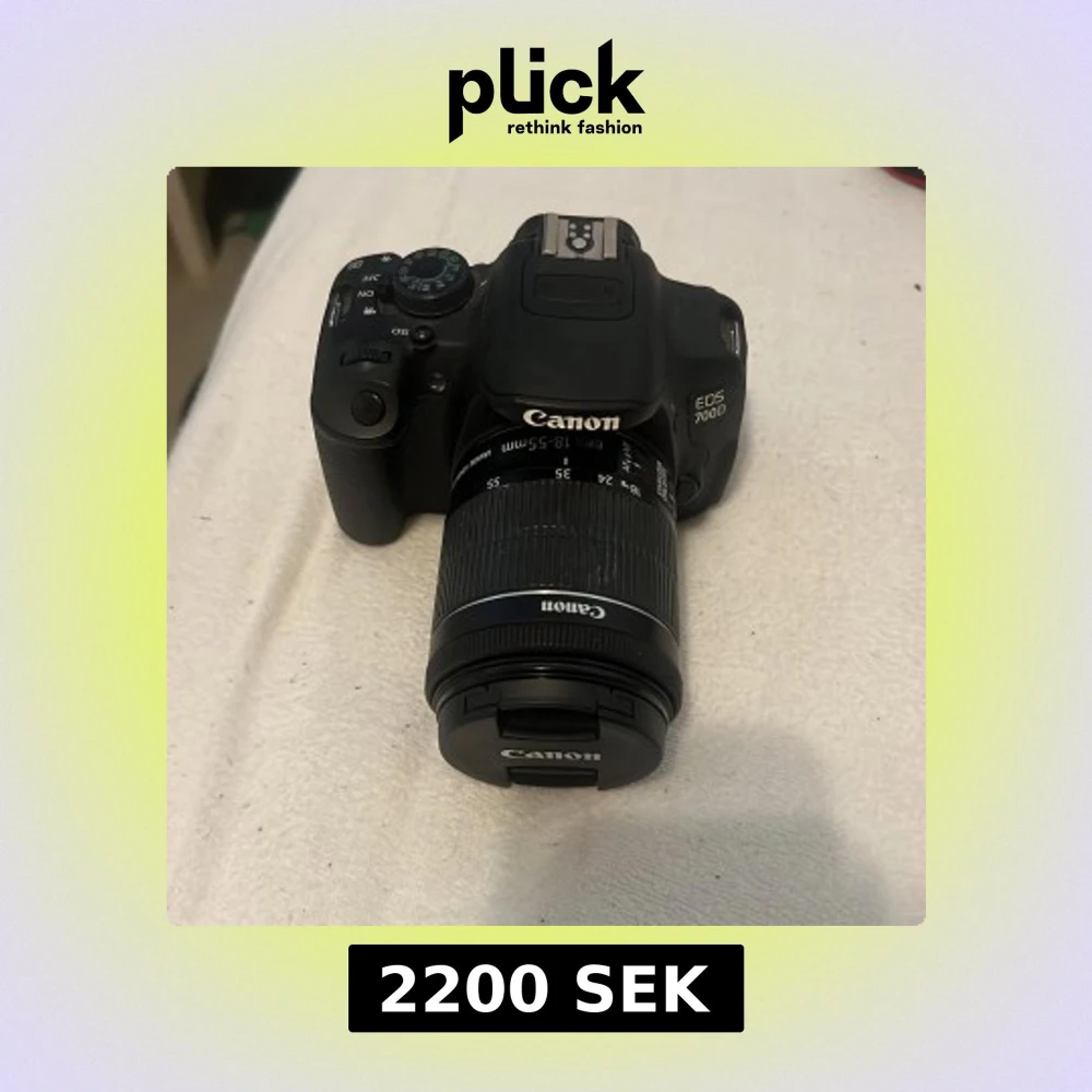 Bilderna visar en Canon EOS 700D systemkamera med ett 18-55mm objektiv. Kameran är svart och har flera manuella inställningar, perfekt för dig som vill ta din fotografering till nästa nivå. Passar både nybörjare och dig som vill utvecklas inom foto.