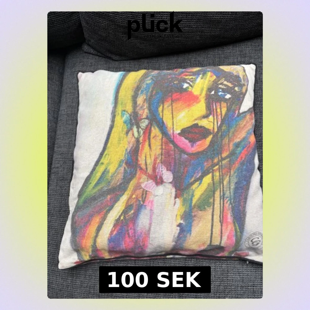 Unikt kuddfodral från Carolina Gynning Design med färgstarkt konstmotiv av kvinnoansikte och fjärilar. Materialet är i gott skick, inga synliga fläckar eller skador. Perfekt för att ge soffan ett konstnärligt och personligt uttryck.