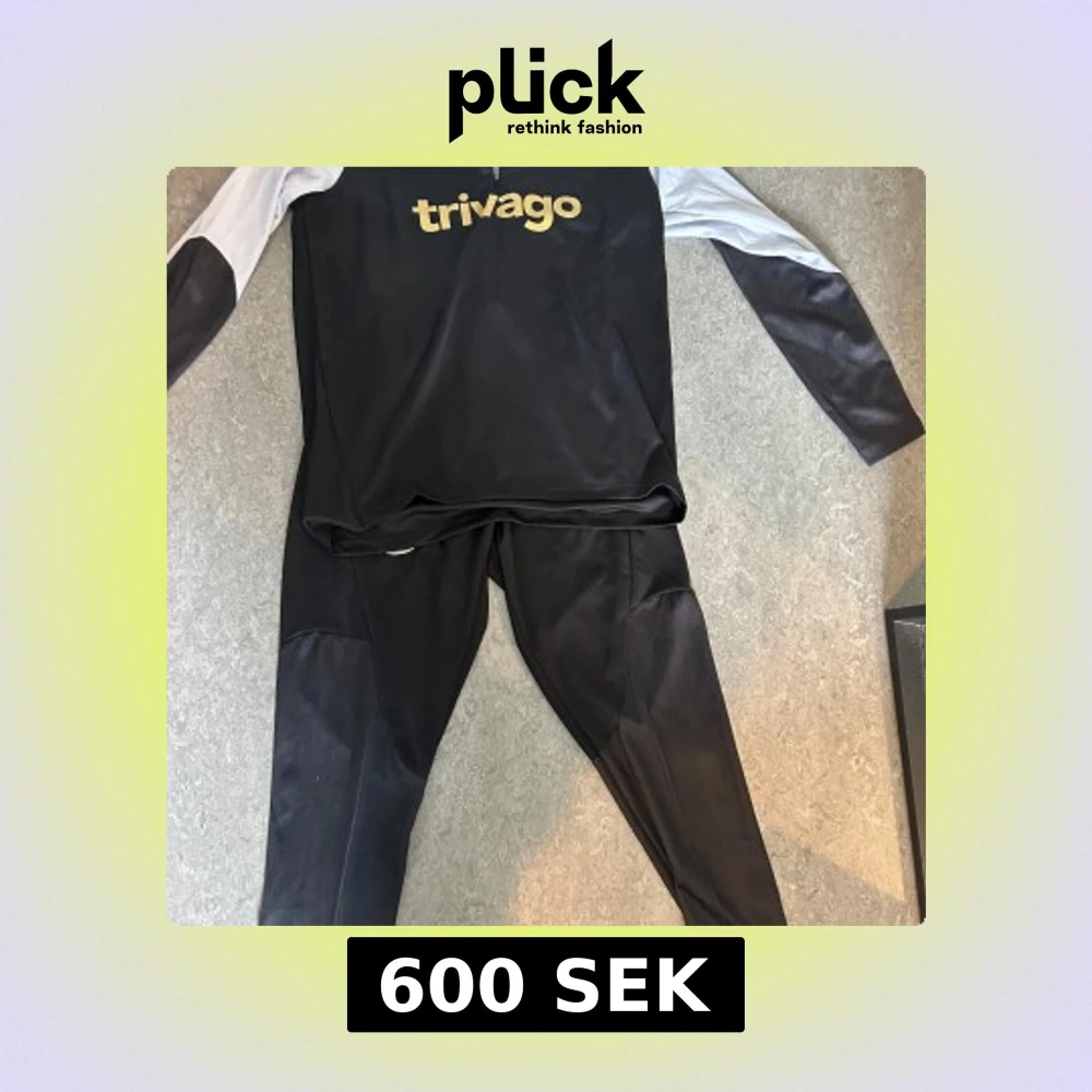 Chelsea FC träningsset från Nike med långärmad svart tröja och svarta byxor. Tröjan har vita partier på axlar och ärmar, guldiga loggor och 'trivago' tryckt på bröstet. Byxorna har Chelsea-märke och Nike-logga i guld. Materialet är lätt och andas, perfekt för träning.
