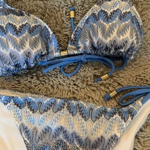 Asfin blå bikini som är i storlek l (passar m, eventuellt s)💙 fina gulddetaljer och fina färger som passar perfekt för sommaren!💙 frakt: 59 kr💙 ALDRIG ANVÄND!!