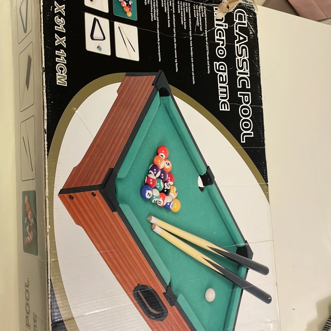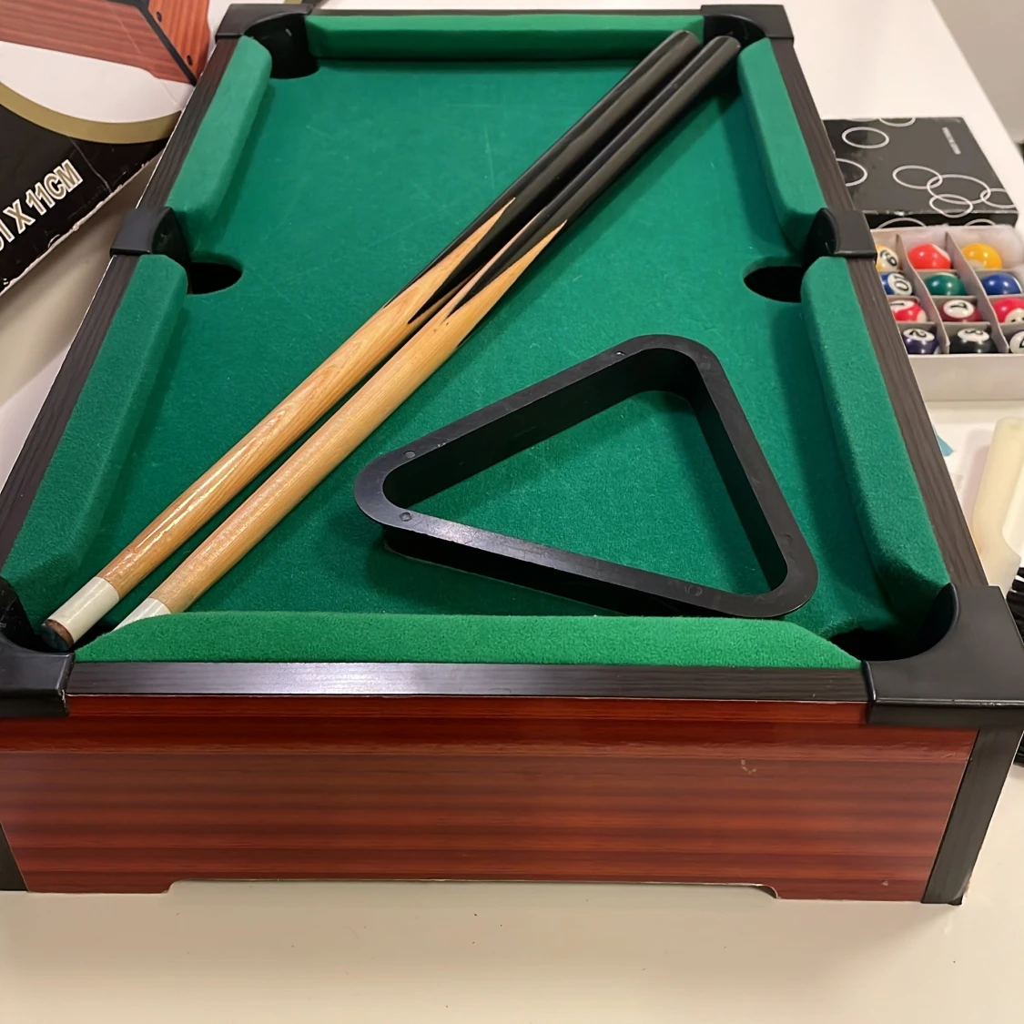 Kompakt biljardbord i trä med grön filt, komplett med två köer, set med biljardbollar, triangel, borste och krita. Perfekt för hemmabruk eller kontoret. Bordet och tillbehören är i gott skick, kartongen har visst slitage. Mått: 51x31x11 cm.