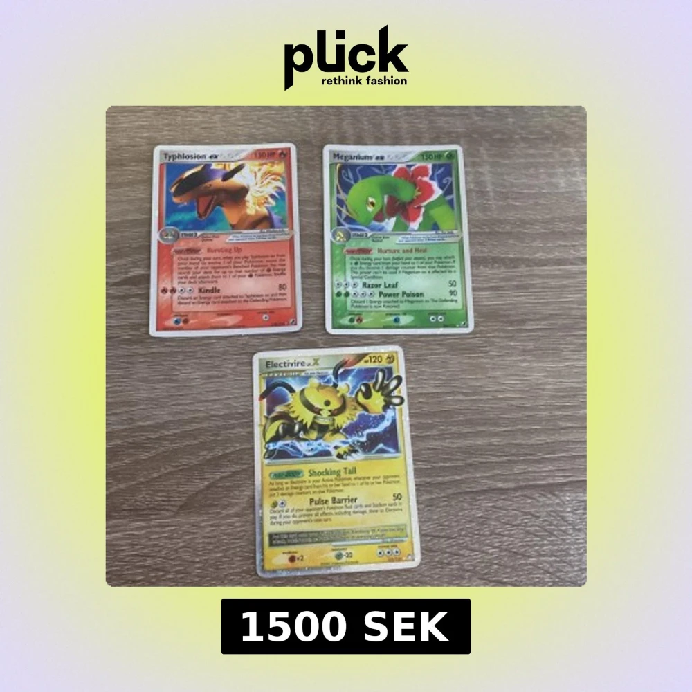 Säljer tre äldre Pokémon kort, Typhlosion ex, Meganium ex och Electivire lv. X. Från vad jag vet kan de vara dyra om de är högre på PSA skalan. Jag har inget behov för dem längre så säljer dem. Alla kort går att köpa enskilt om det önskas! :)