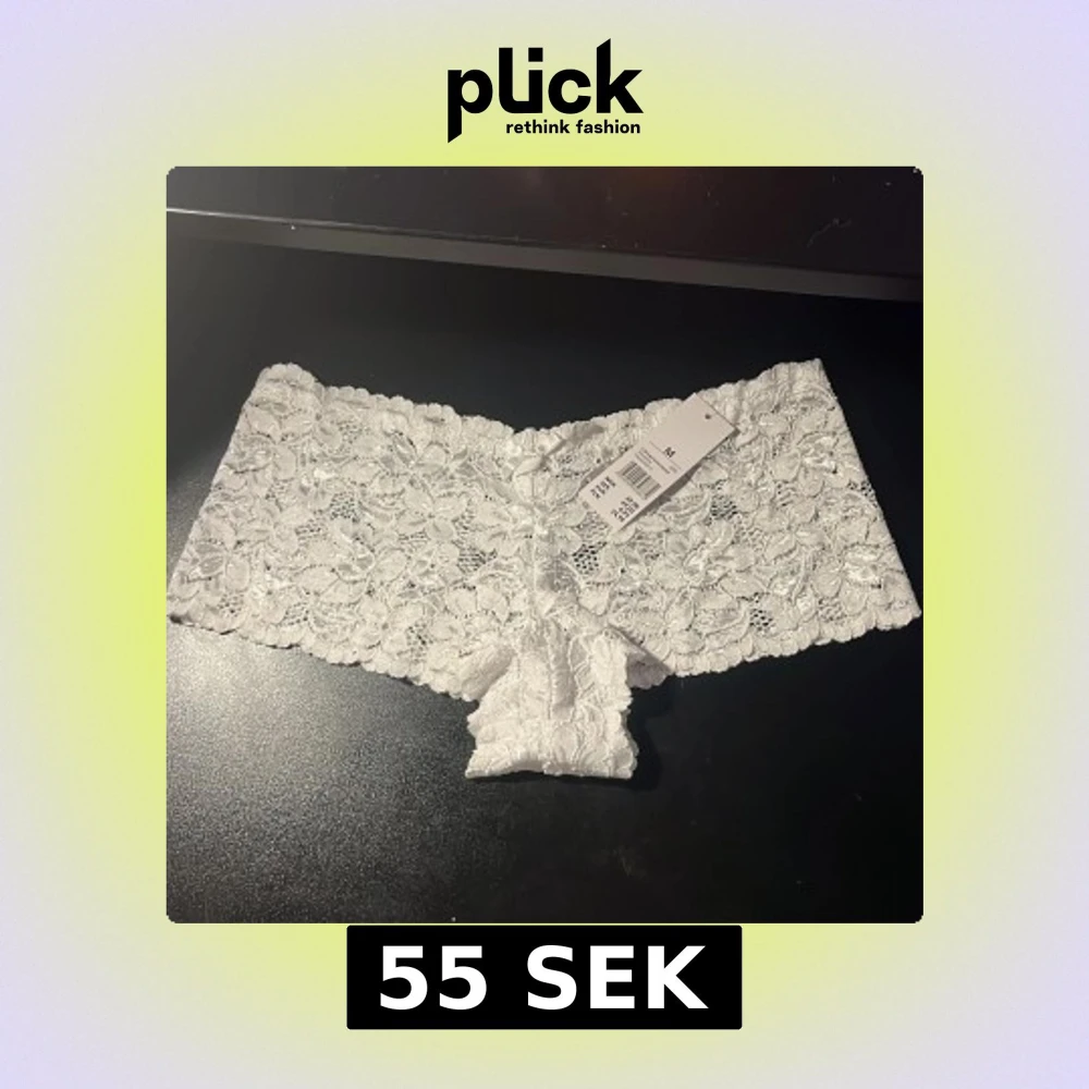 Säljer ett par vita oanvända hipster-trosor i bred spets med blommigt mönster. Storlek M.