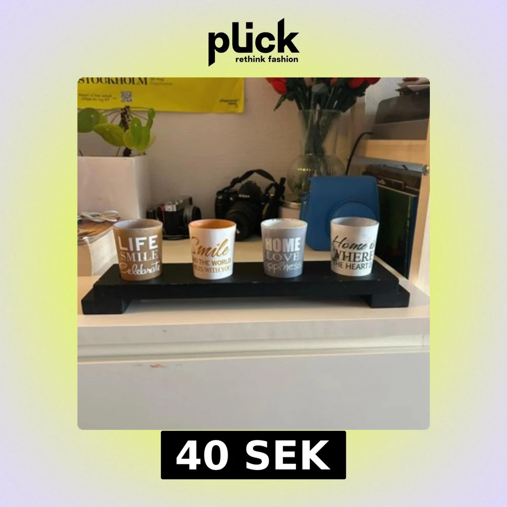 Ljushållare i trä med 4 stycken glas till små ljus. Inga ljus inkluderade.
