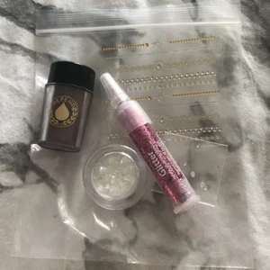 Olika nageltillbehör som shimmer, glitter, paljetter, osv