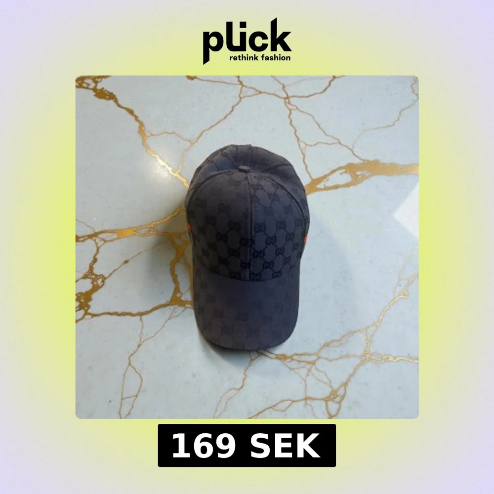 Säljer en mörkblå designer keps från med det klassiska GG-mönstret över hela kepsen. På sidan finns en snygg detalj med gröna och röda ränder. Kepsen har böjd skärm och är tillverkad i ett slitstarkt material.