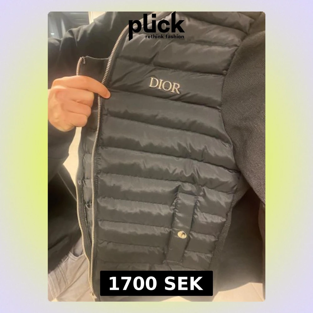 Säljer en svart dunväst från Dior med quiltad design och silverfärgad dragkedja. Västen har broderad Dior-logga på bröstet och praktiska fickor med knappstängning. Materialet är polyester och dun, perfekt för lager-på-lager under höst och vinter.
