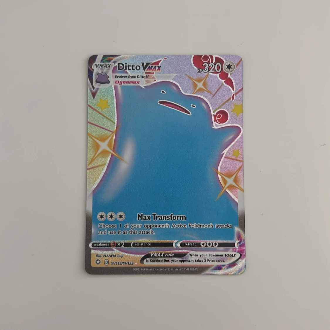 Cool och glittrig Pokémonkort med Ditto VMAX! Perfekt för samlare och spelare som vill ha något unikt i sin kortlek. Kortet har färgstark design och är en riktig eye-catcher för alla Pokémon-fans. Kortet är självklart äkta och även i riktigt fint skick då jag hade iallafall get kortet en 9.5/10, Vid frågot hör gärna av er, ifall ni är intresserade av pokemon kort kolla gärna mer på min profil!