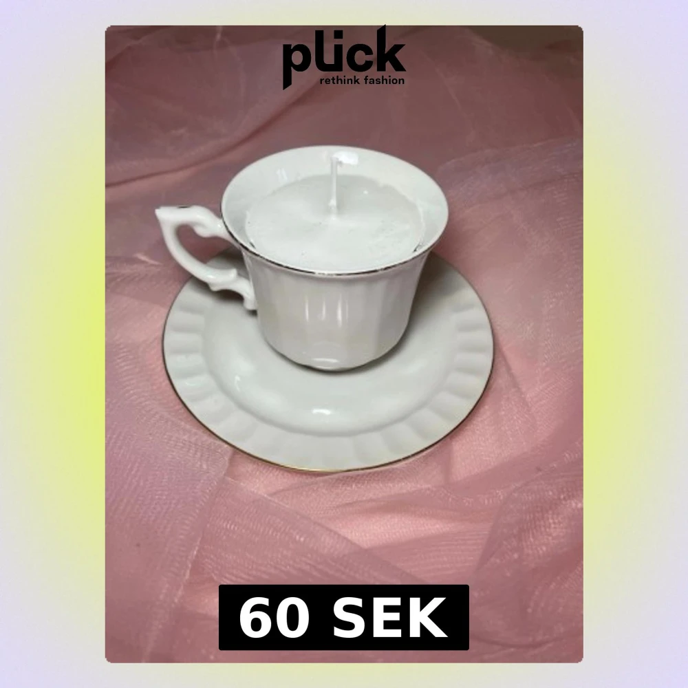 Det här ljuset är gjort av återanvändbara material. Tekoppen är köpt secondhand och stearinet är från kyrkor som tänkte slänga det. Det här ljuset har en svag doft utav vanilj, så känsliga även kan använda det. Det finns även fler ljus med denna design på hemsidan, om man vill köpa sets.